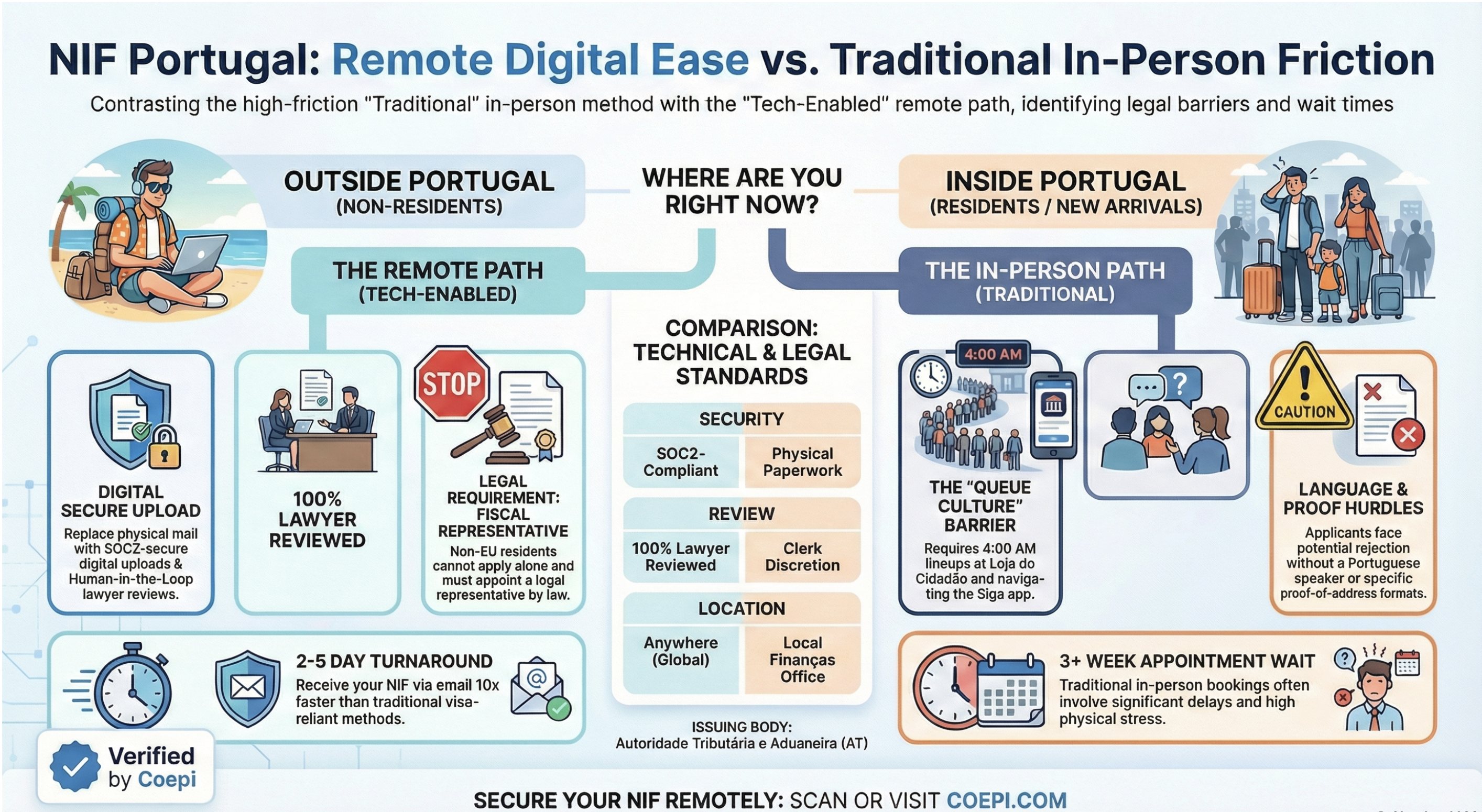 - Coepi.eu Solution: We act as your tech-enabled bridge. We handle the appointment of a legal representative and manage the digital submission to the Finanças portal, ensuring your NIF is ready before you buy your plane ticket.